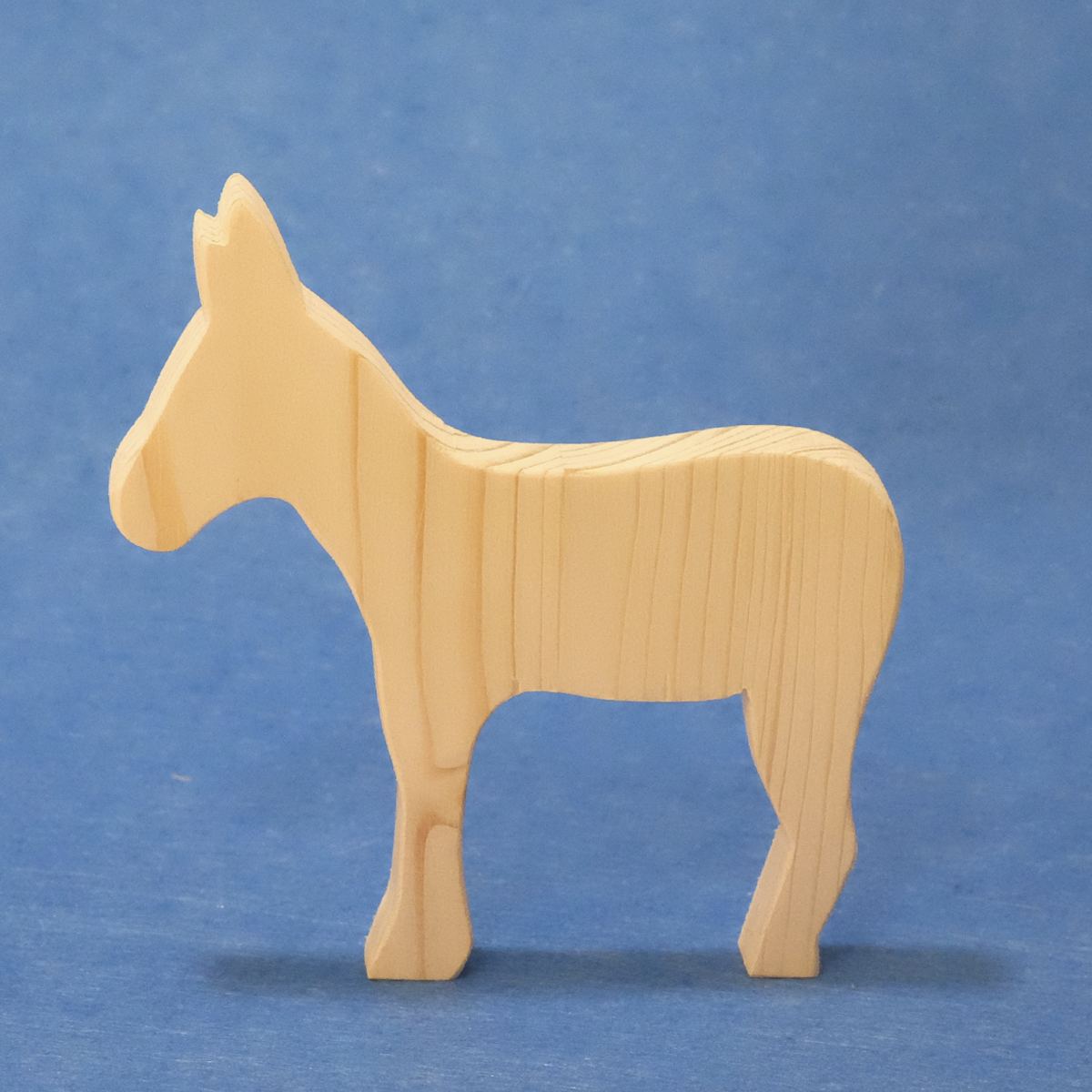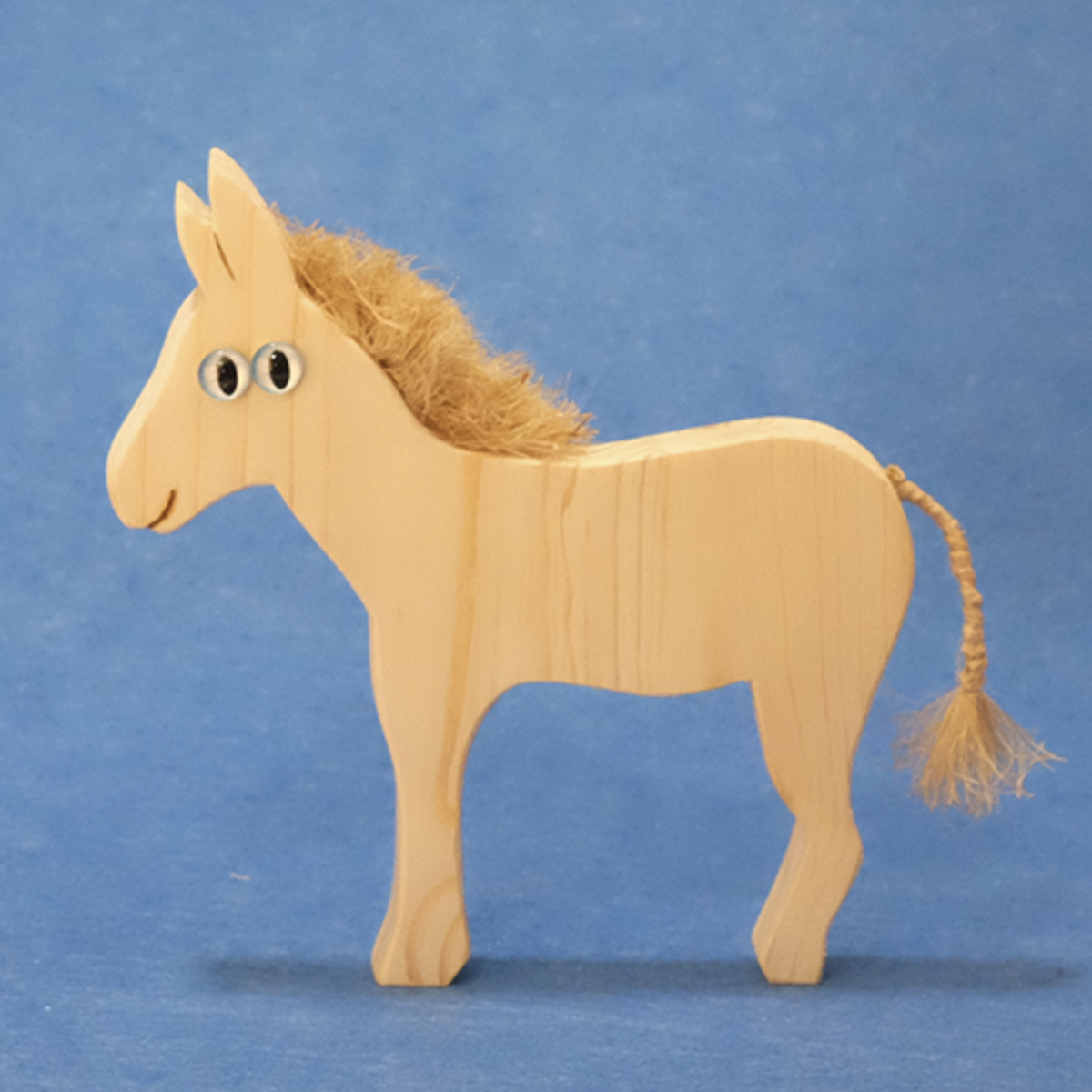 Burrito de madera con dos versiones a elegir: una silueta sin decoraciones, para niños de cualquier edad y un burro sonriente, con ojos de cristal y crin, para mayores de 5 años.