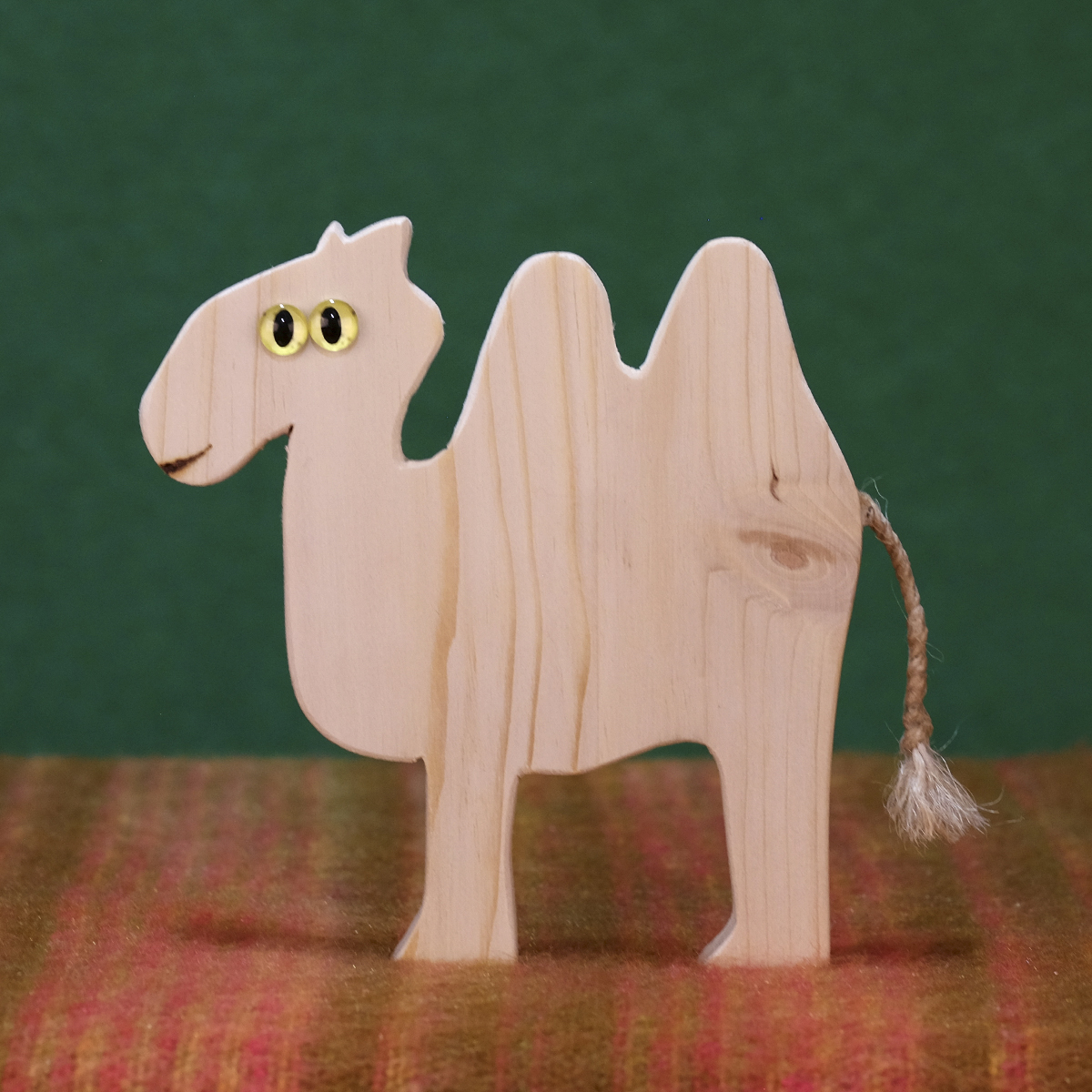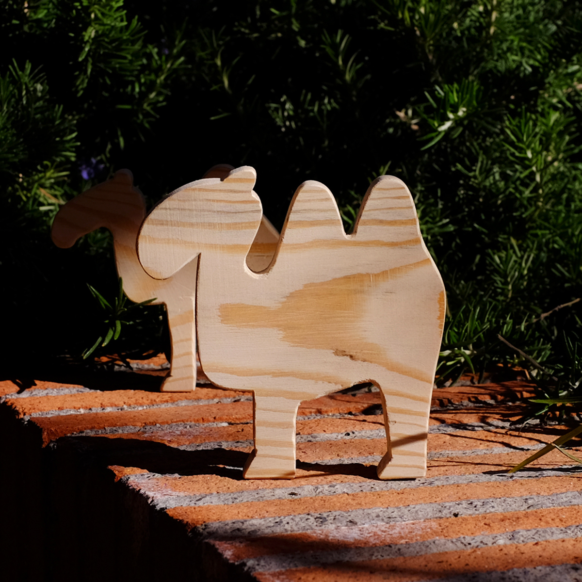 Camello de madera con dos versiones a elegir: una silueta sin decoraciones, para niños de cualquier edad y un camello sonriente, con ojos de cristal, para mayores de 5 años.