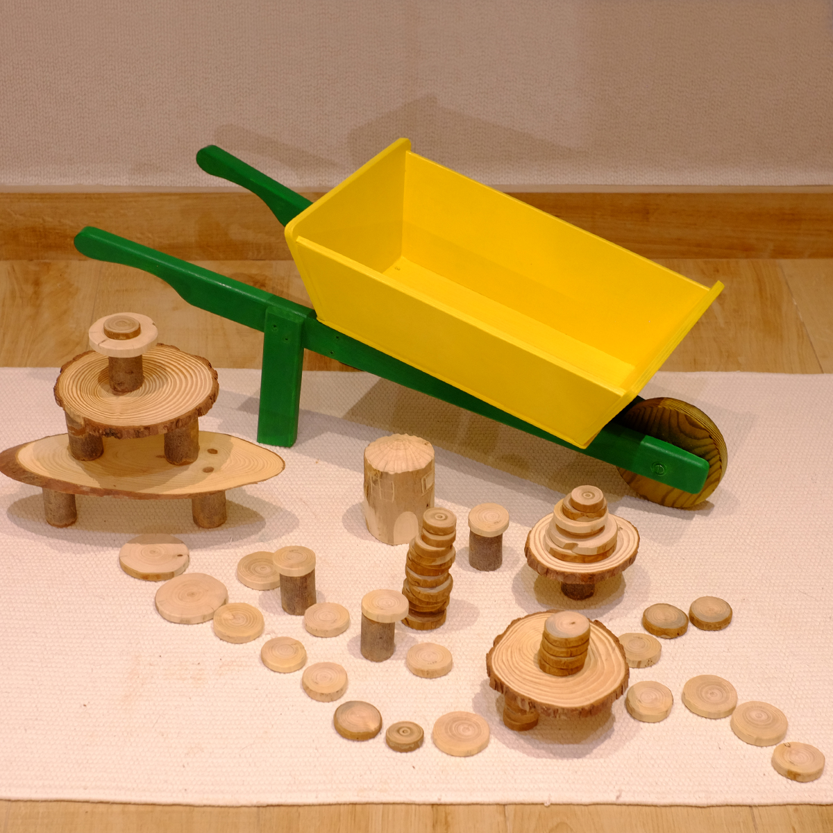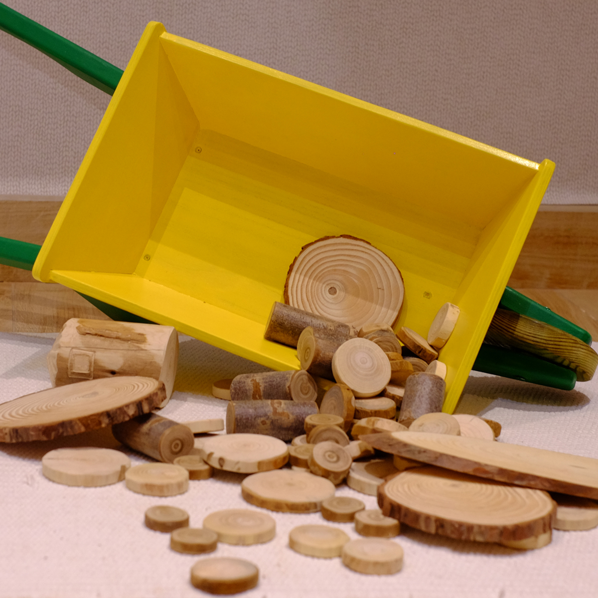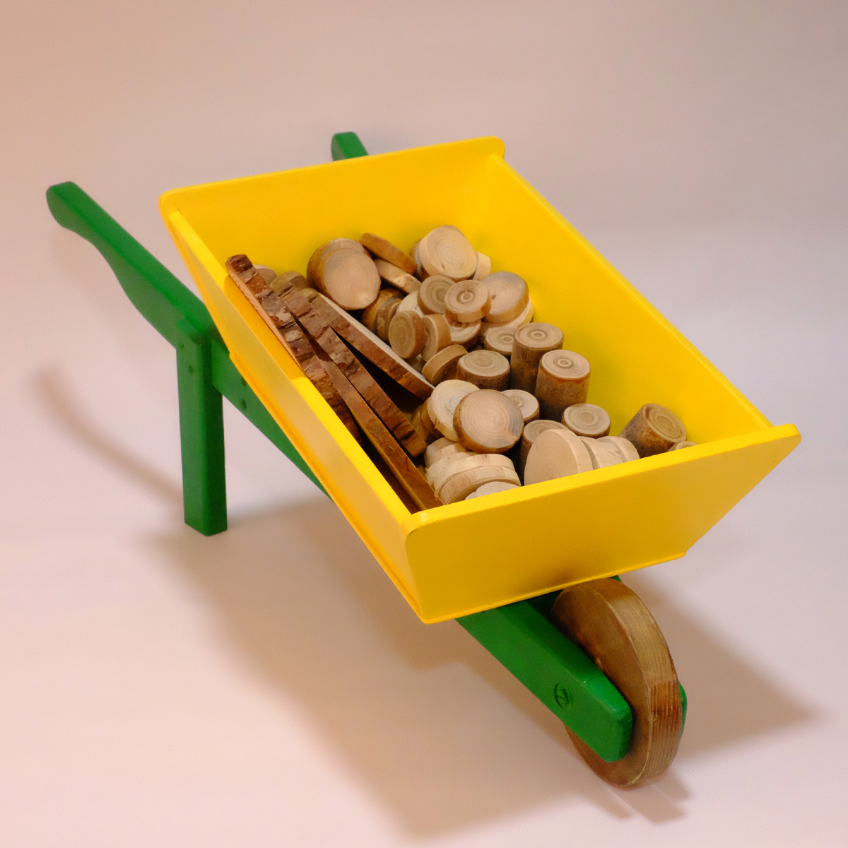 Auténtica carretilla de juguete con carga de troncos, completamente de madera maciza y pintada con pintura apta para juguetes (totalmente libre de toxicidad). Esta carretilla imita a las carretillas de los adultos y viene llena con un buen cargamento de troncos y «palitroques» (también conocidos como «bloques de construcción de madera natural»), que hacen las delicias de los niños por su abundancia, variedad de formas y tamaños y por ser un material totalmente natural. Concretamente, la carga de esta carretilla es de: