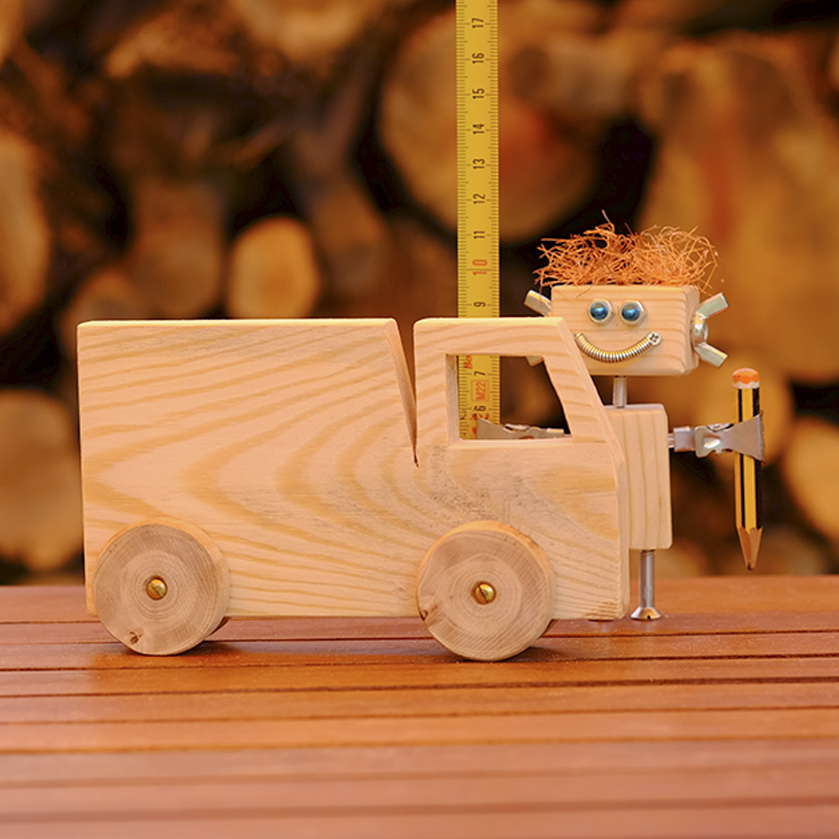 En el parque móvil de Paloverso no podía faltar un coche de bomberos de juguete. Es de madera maciza de pino, con una auténtica escalerilla artesanal y ruedas de rodajas de ramas. Su altura es de 8,5 cm, como se puede ver en la fotografía en la que nuestro ayudante sostiene el metro (el ayudante no está incluido con el coche). Y como todo en Paloverso, está hecha con nuestro particular método Slow Wood: a mano y con cariño.