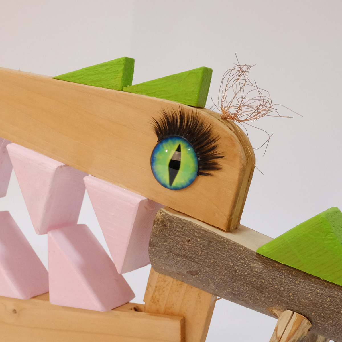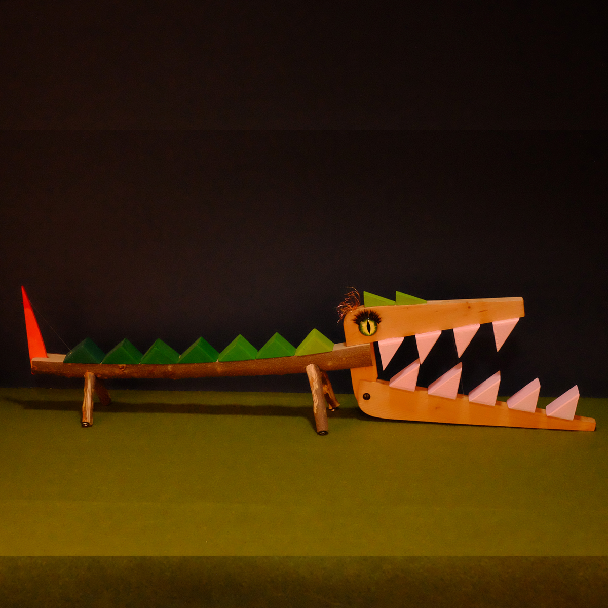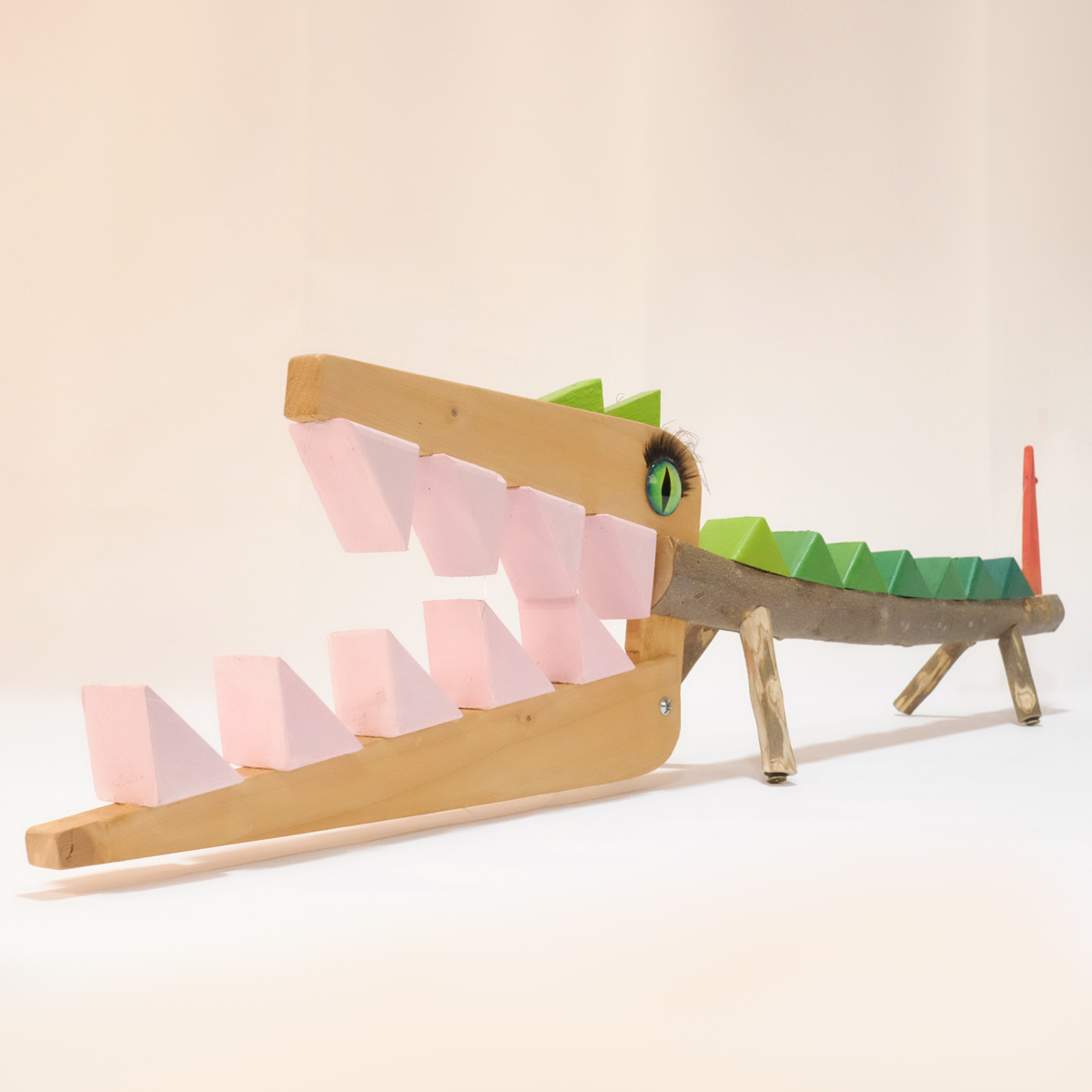 La cocodrula fue el primer personaje de nuestro universo de palo, así que se ha convertido en nuestra mascota. Este simpático ser surgió de una sugerente hilera de triángulos y palos reunidos en nuestro taller.