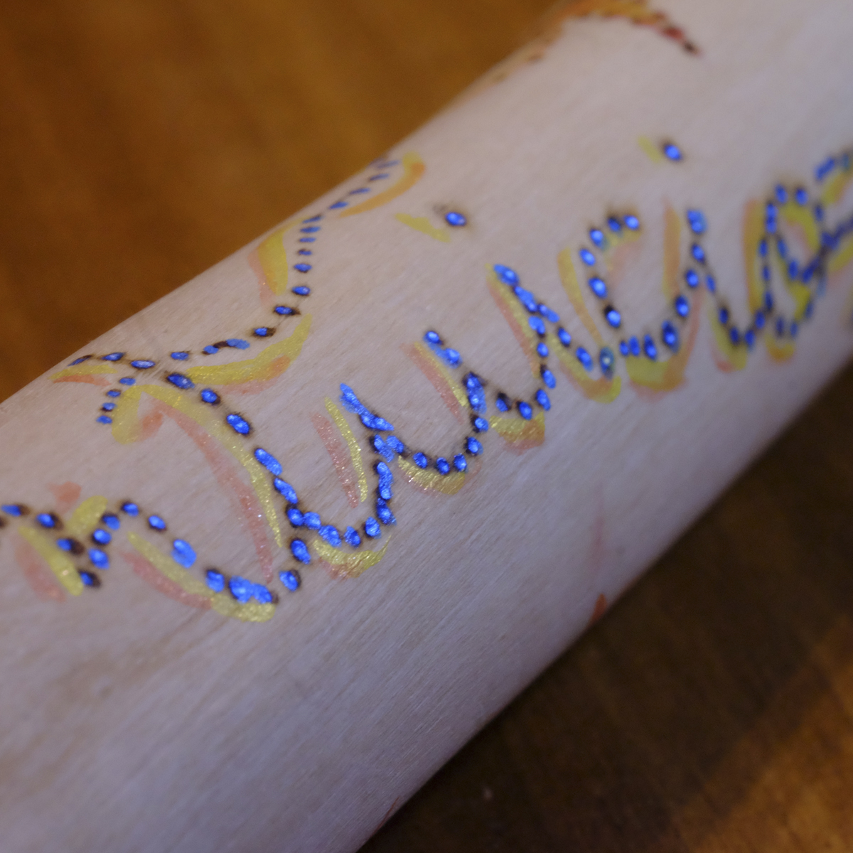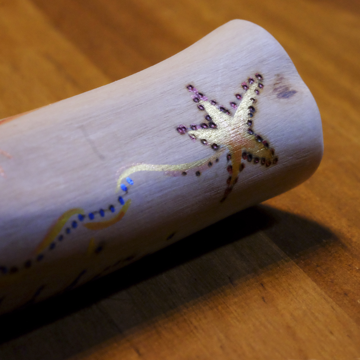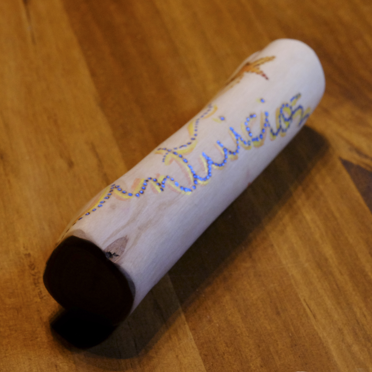 Este tótem único está creado utilizando una rama. Su tamaño es de 14,5 cm de alto x 2,5 cm de diámetro, una vez que la hemos secado y lijado cuidadosamente para que sea muy agradable al tacto. Luego hemos pirografiado «INTUICIÓN» y pintado con color azul, que es el color con el que se representa el Ajna o chakra del tercer ojo, relacionado con la intuición. Los dibujos de la madera nos han inspirado unas formas en movimiento, expansivas y de colores cálidos, representando una especie de fuego chispeante. ¡Ojalá todos pudiéramos desarrollar la intuición y acceder a la realidad no como la interpretamos, sino como es!