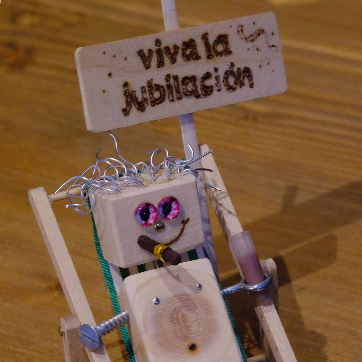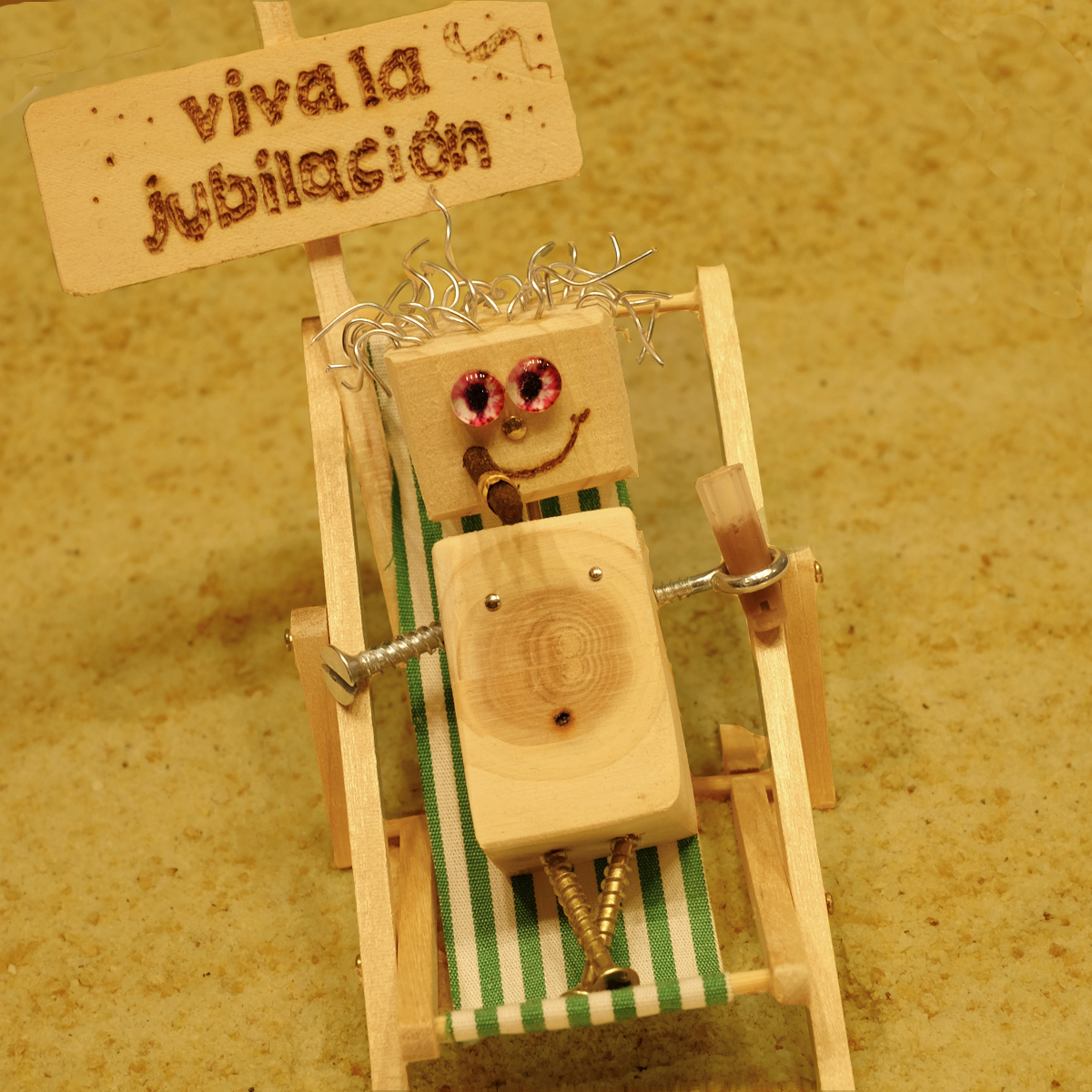 El Jubileta en cuestión se ha tomado muy en serio su nuevo estado y aquí lo tenemos, cómodamente tumbado en una hamaca de la playa, con un «cubata» en una mano y fumando un puro habano. Todo es muy pequeñito, la figura con su cartel tiene 10 cm de alto. Puedes ver la medida gracias a nuestro ayudante medidor, que no forma parte del «Jubileta», solo nos ayuda cortésmente para que veáis las dimensiones de nuestras creaciones. Este es un detalle para regalar único.