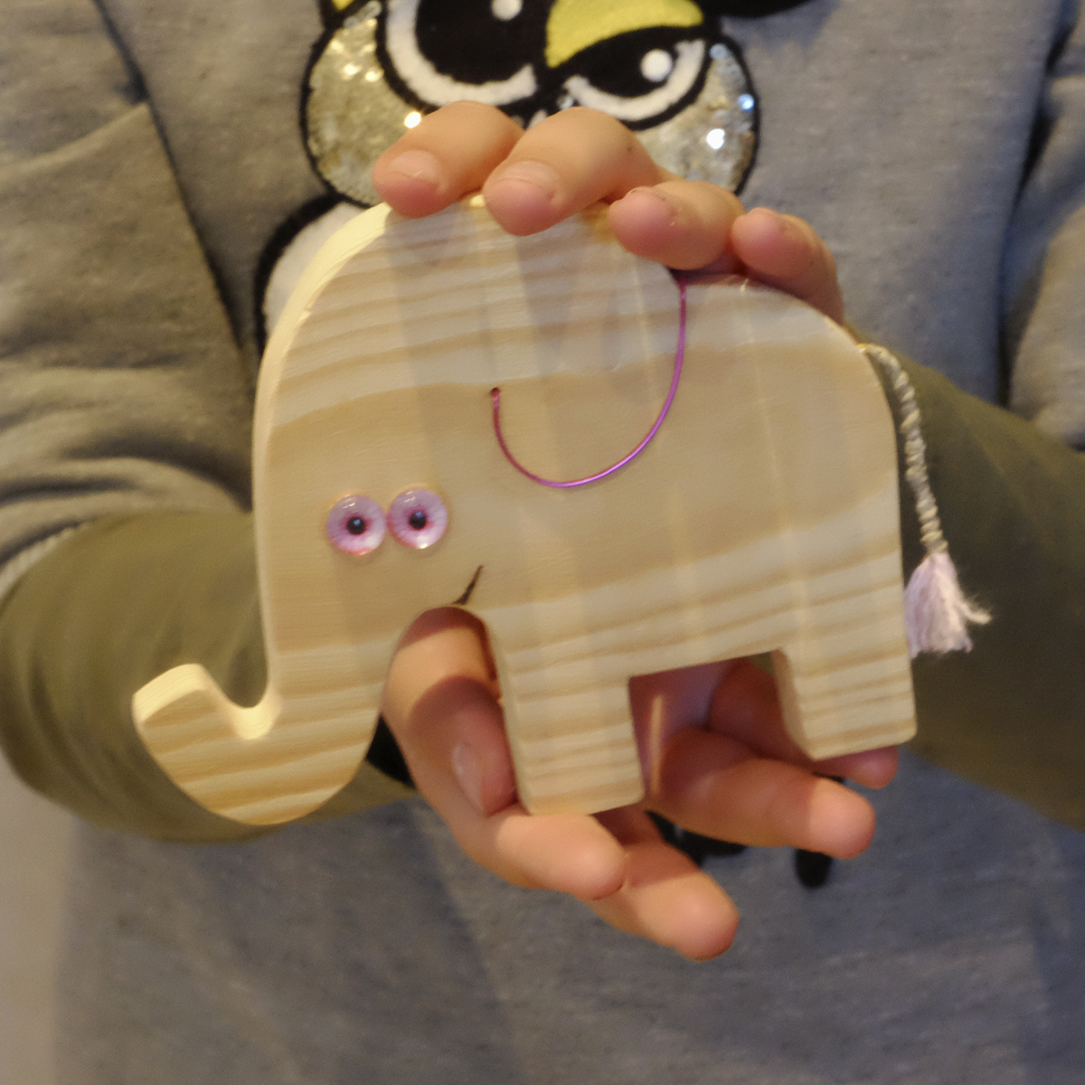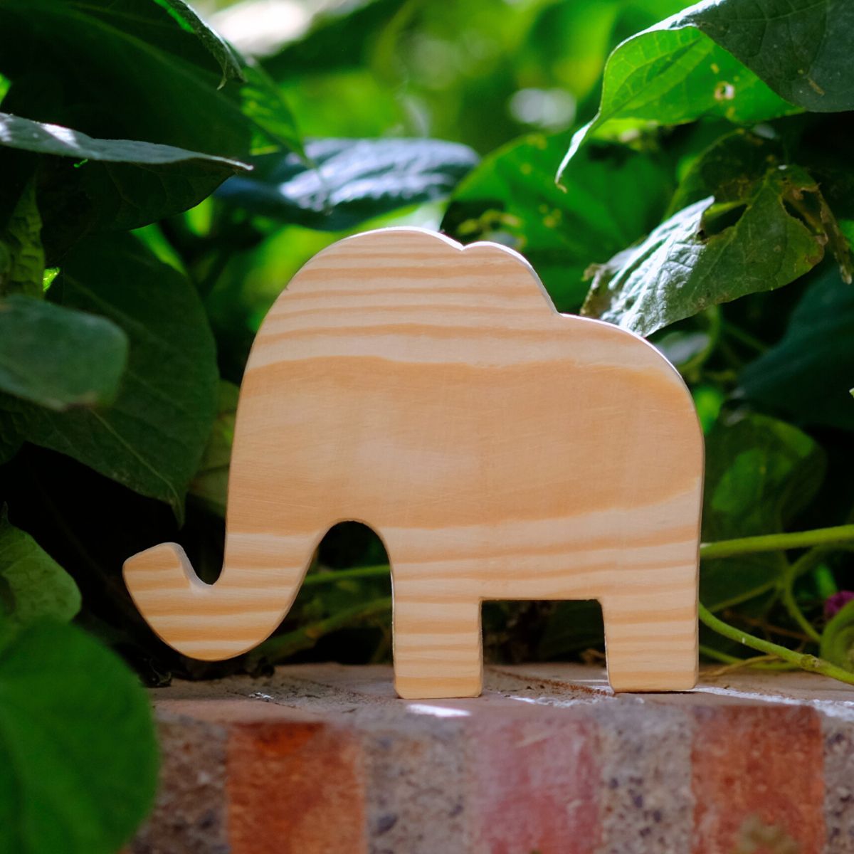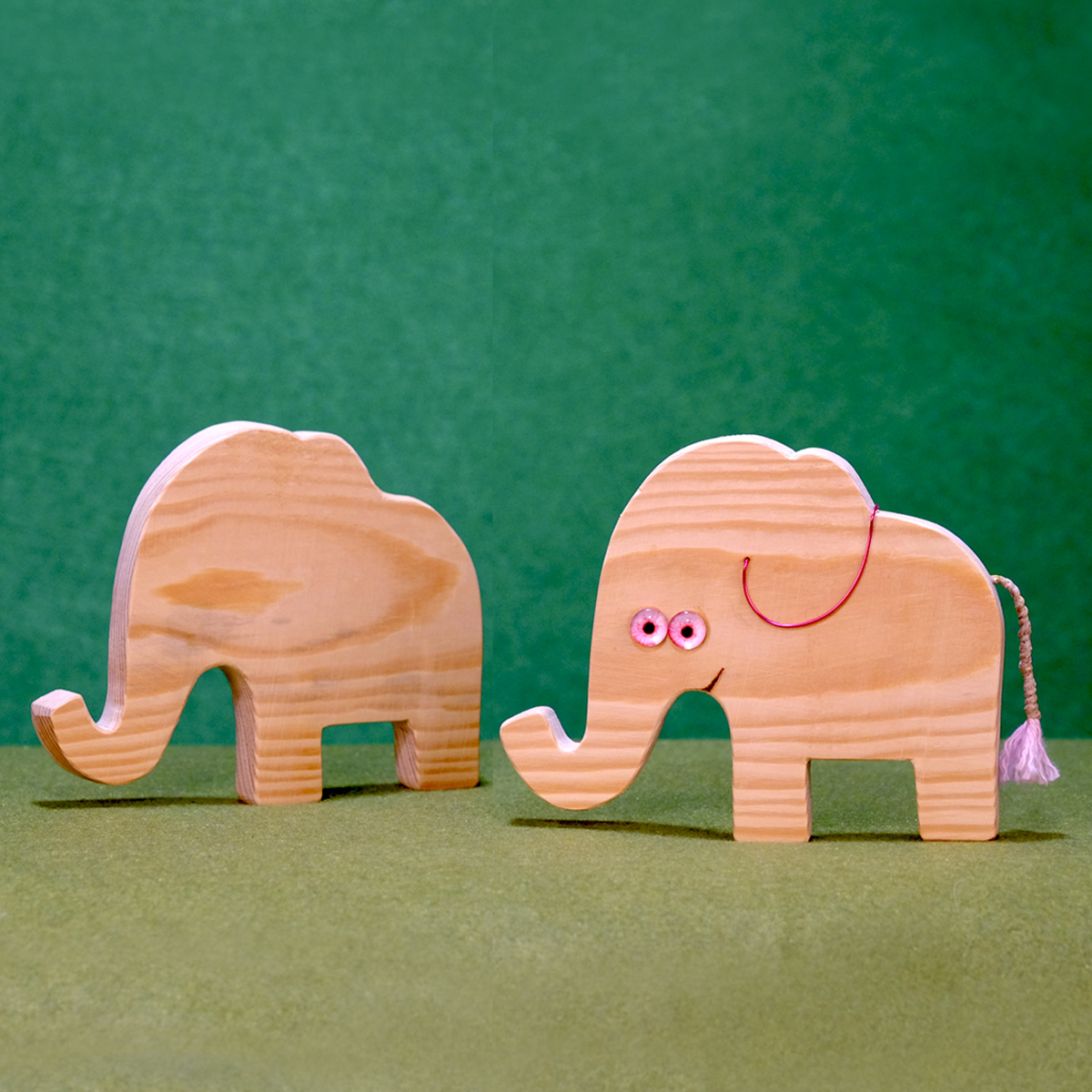 Elefante de madera con dos versiones a elegir: una silueta sin decoraciones, para niños de cualquier edad y un elefante sonriente, con cola, oreja y con ojos de cristal, para mayores de 5 años.