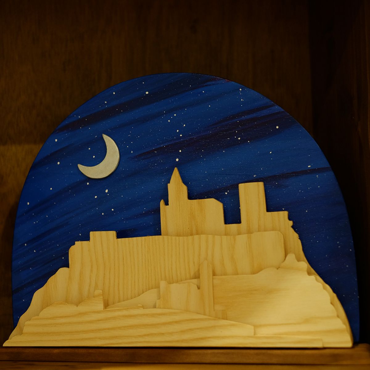 Cuadro tridimensional de la Fortaleza de la Mota de Alcalá la Real, Jaén, el pueblo de este «universo de palo» 😉 Escena nocturna, donde representamos la luna creciente sobre un cielo estrellado y la Mota iluminada. El regalo perfecto para cualquier alcalaíno: el emblema de su tierra. Un detalle único y muy especial.