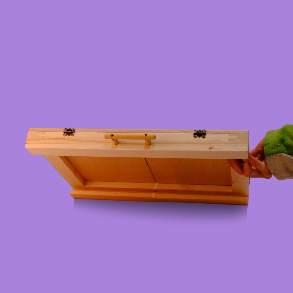 Los kamishibais estándares son de formato A3 o grandes y A4 o pequeños. Este es el kamishibai grande y su tamaño es 45,5 cm de largo x 37 cm de alto. Tiene 5 cm de grosor.