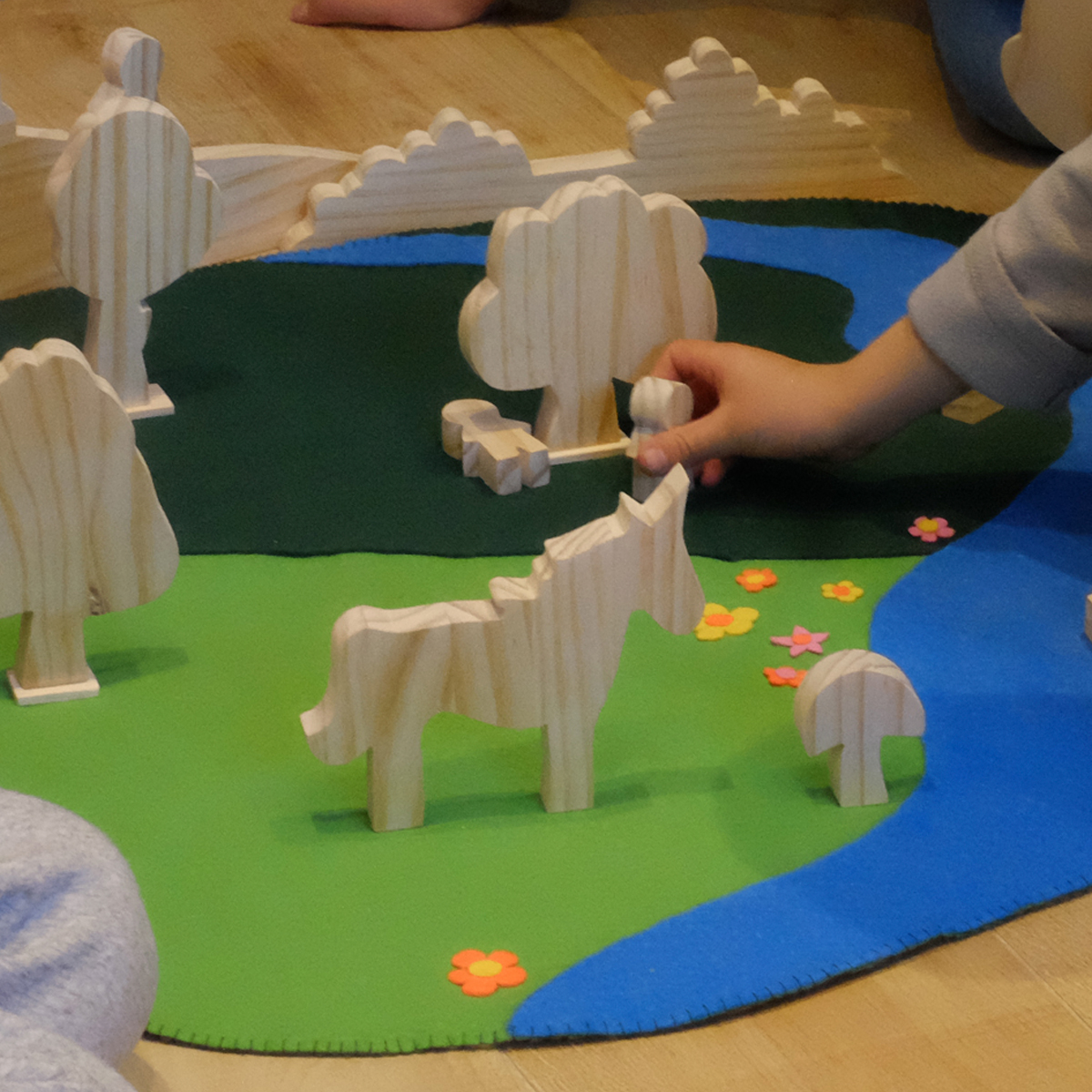 Queremos fomentar en los pequeños la visión de conjunto y ecosistema: que cada una de las partes es una pieza imprescindible para el equilibrio de la naturaleza. Para que los niños, desde el juego, sientan que todos formamos una familia, incluido el ser humano: montañas, río, sol, animales, plantas y personas. Por eso hacemos pequeños universos en los que los niños puedan desarrollar su imaginación a la vez que viven el concepto de unidad. Todos estamos unidos, aunque vivamos en escenarios diferentes, por ejemplo el mar, el oeste, o el desierto.