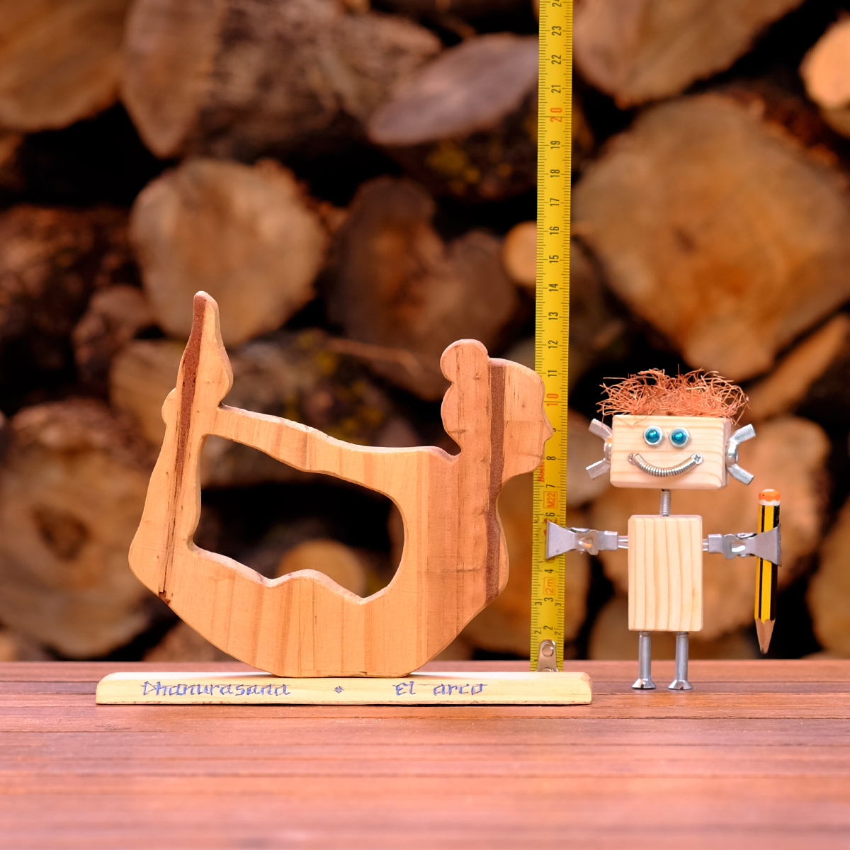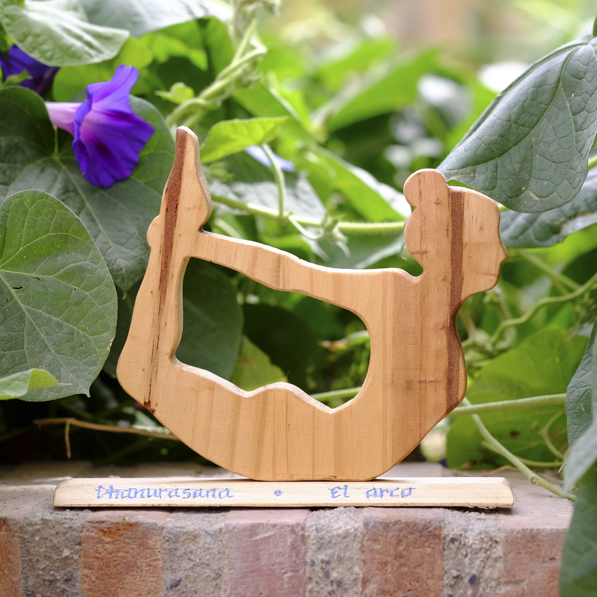 Figura de yoga en madera que representa la asana «el arco«, sobre una base de madera donde está escrito a mano el nombre en castellano y en sánscrito: «Dhanurasana«. La postura de yoga «el arco».