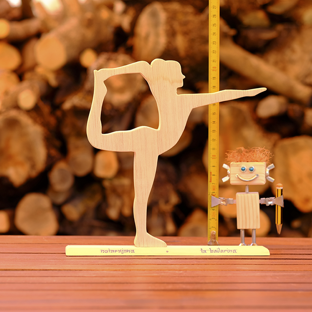Sentimos debilidad por las asanas, la belleza y fuerza que transmiten sus imágenes. Pero entre todas, la postura de yoga «La Bailarina» destaca por su gracilidad y elegancia. De hecho, simboliza el Rey de la Danza hindú Nataraja y ese es el nombre de esta postura en sánscrito. Representamos en madera la postura de yoga «La Bailarina», su perfecta ejecución, para inspiración de cualquier amante del yoga, que busque no solo su expresión artística, sino también su aspecto de evolución personal, en búsqueda del equilibrio y la armonía. La figura asienta sobre una base de madera en la que se mantiene en perfecto equilibrio (si prefieres, podemos pegar la figura a la base) y hemos escrito su nombre en castellano y en sánscrito.