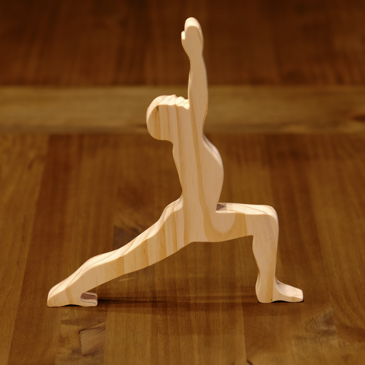 Primera de las 3 posturas del guerrero, que representan a Virabhadra, guerrero mítico en la tradición hindú del que te contamos su interesante historia más abajo*. Figura de madera de la postura de yoga «el guerrero I», sobre una base también de madera donde se puede leer el nombre de la postura en sánscrito y en castellano. Todo hecho a mano, con el máximo cuidado por los detalles y diseñada para mostrar la perfecta ejecución del asana.