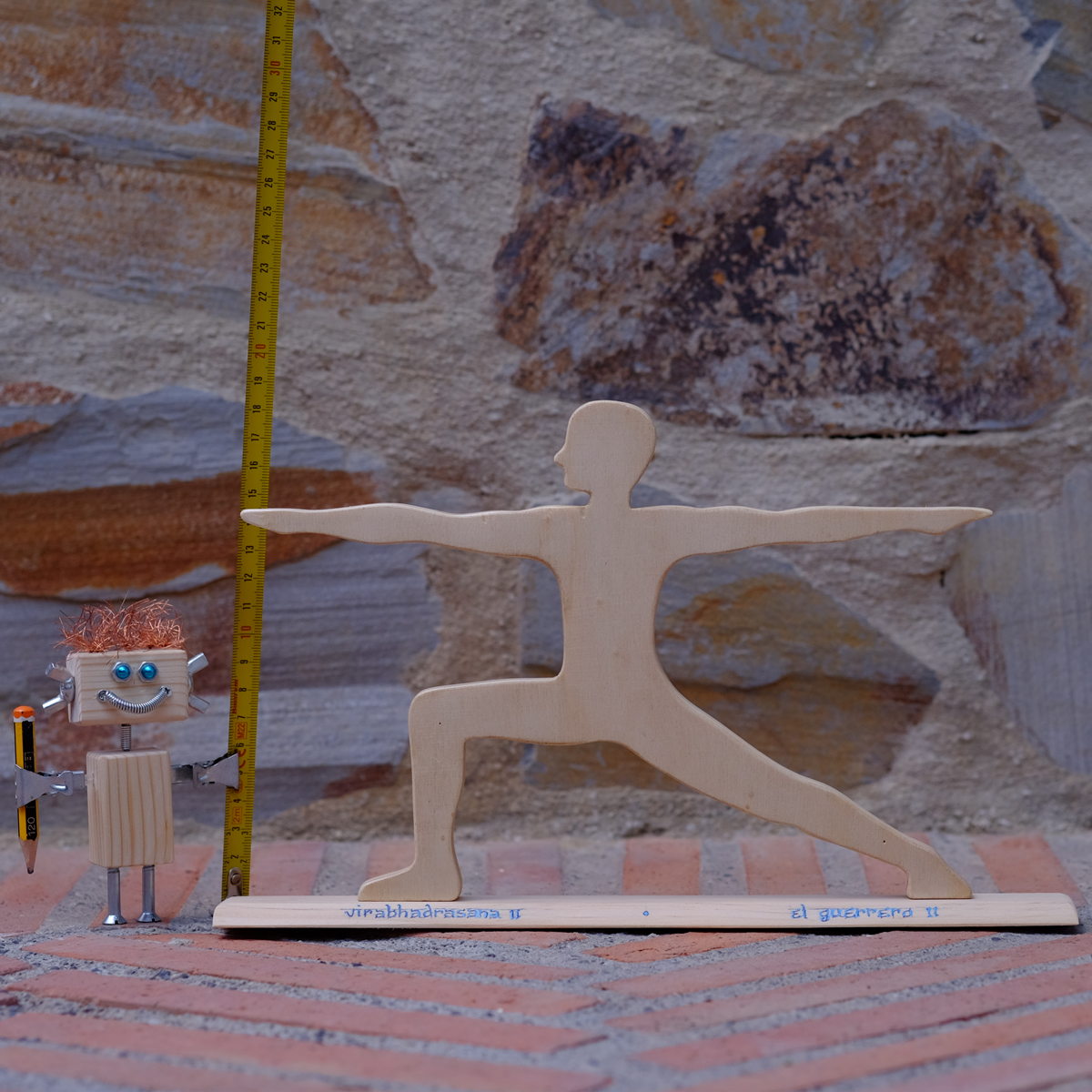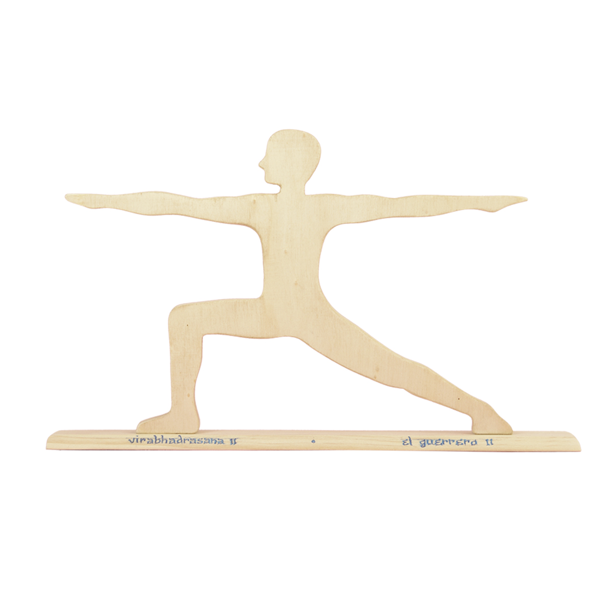Figura de la postura de yoga «el guerrero II», elaborada en madera de forma totalmente artesanal. La silueta del guerrero se asienta sobre una base de madera (son separables figura y base) en la que está escrito el nombre de la asana en sánscrito y en castellano.