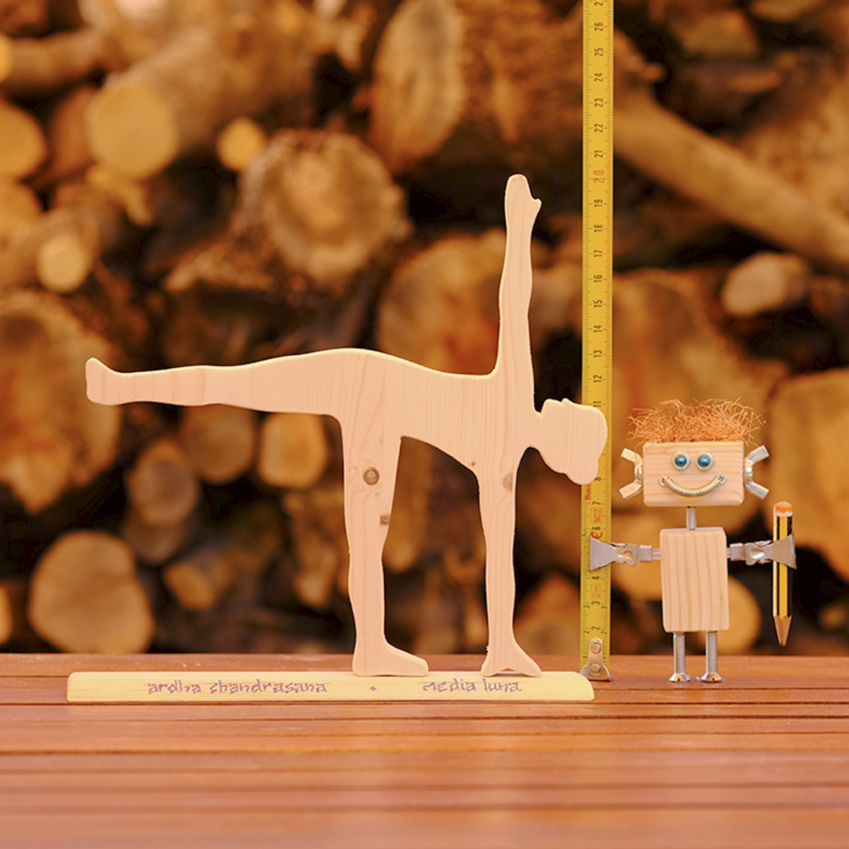 La postura de yoga «La Media Luna» combina equilibrio, fuerza y flexibilidad. Es conocida como «Ardha Chandrasana» en sánscrito: «Ardha» significa «medio» y «Chandra» es «luna», debido a forma de una media luna que crea el cuerpo cuando se realiza. Esta figura artesanal de madera representa la figura de yoga «La Media Luna» perfectamente ejecutada, por lo que se mantiene en equilibrio sobre su base de madera. En la base está escrito el nombre de esta asana en sánscrito y en castellano.