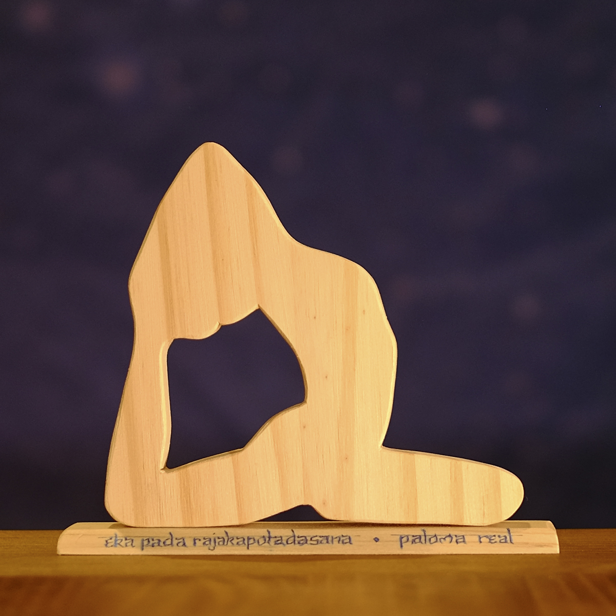 Figura de madera que representa la postura de yoga «La Paloma Real» o «Kapotasana»: «Kapota» en sánscrito significa «paloma» y «asana» es «postura». Los nombres de las posturas de yoga fueron elegidos por los Rishis (antiguos sabios hindúes de profundo conocimiento espiritual y con capacidad para acceder a dimensiones de la conciencia superiores) inspirándose en la mitología, la anatomía o la naturaleza, como en este caso en que la posición del cuerpo imita la forma de una paloma.