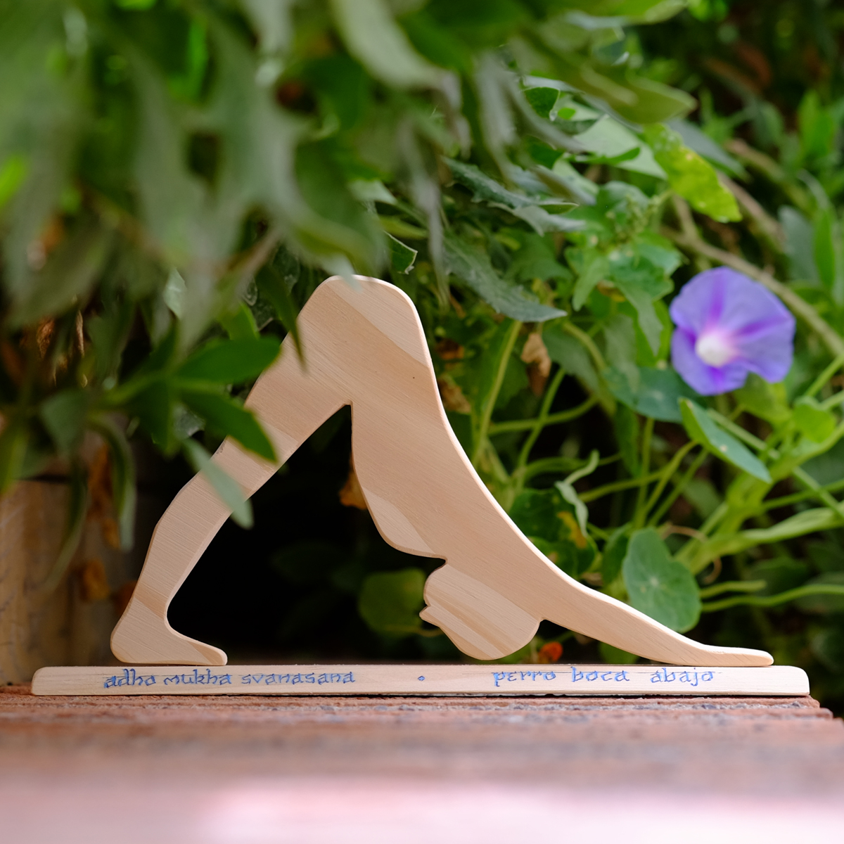 Figura de madera artesanal, de la postura de yoga «el perro boca abajo» o «Adho Mukha Svanasana», como se llama en sánscrito. Esta figura se asienta sobre una base de madera, donde manualmente hemos escrito su nombre en sánscrito y en castellano y puedes ver su altura (12 cm) gracias al simpático ayudante que aparece en una fotografía sujetando el metro ¡no está incluido con la figura!