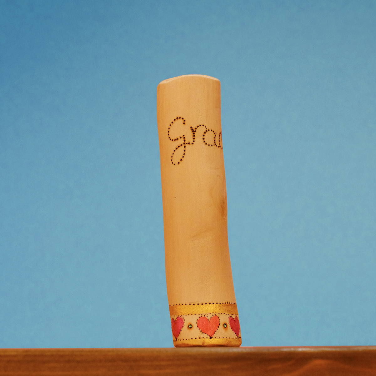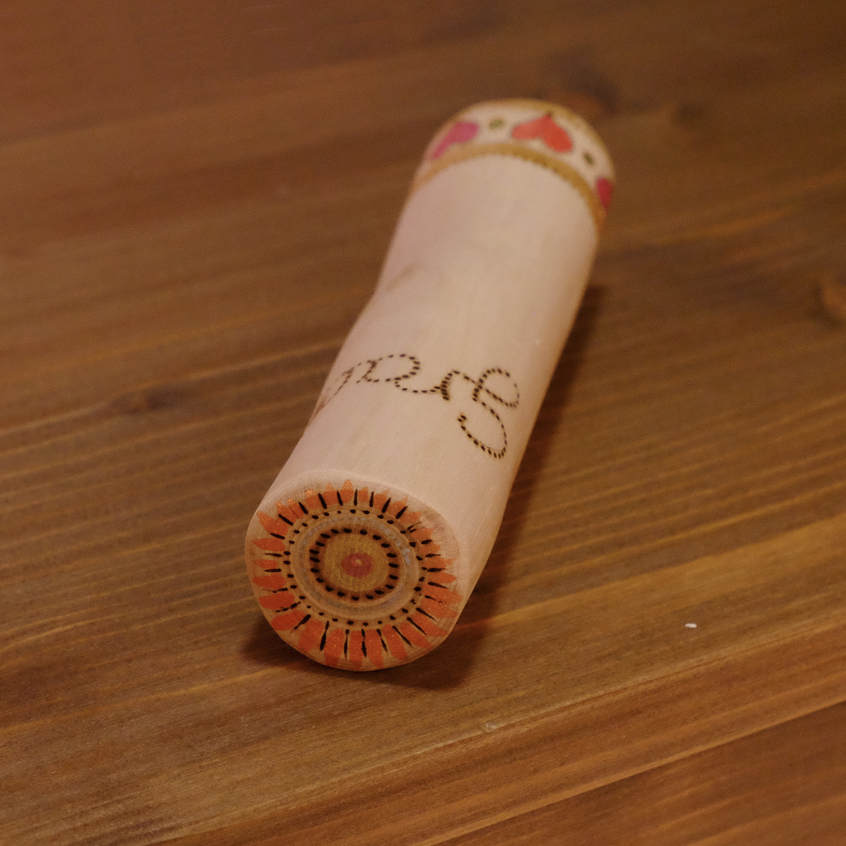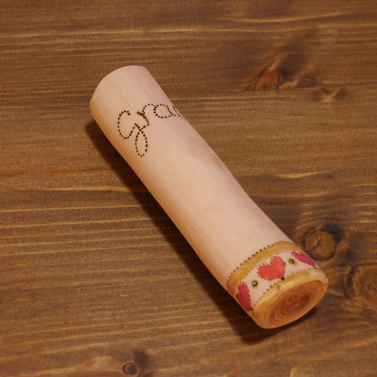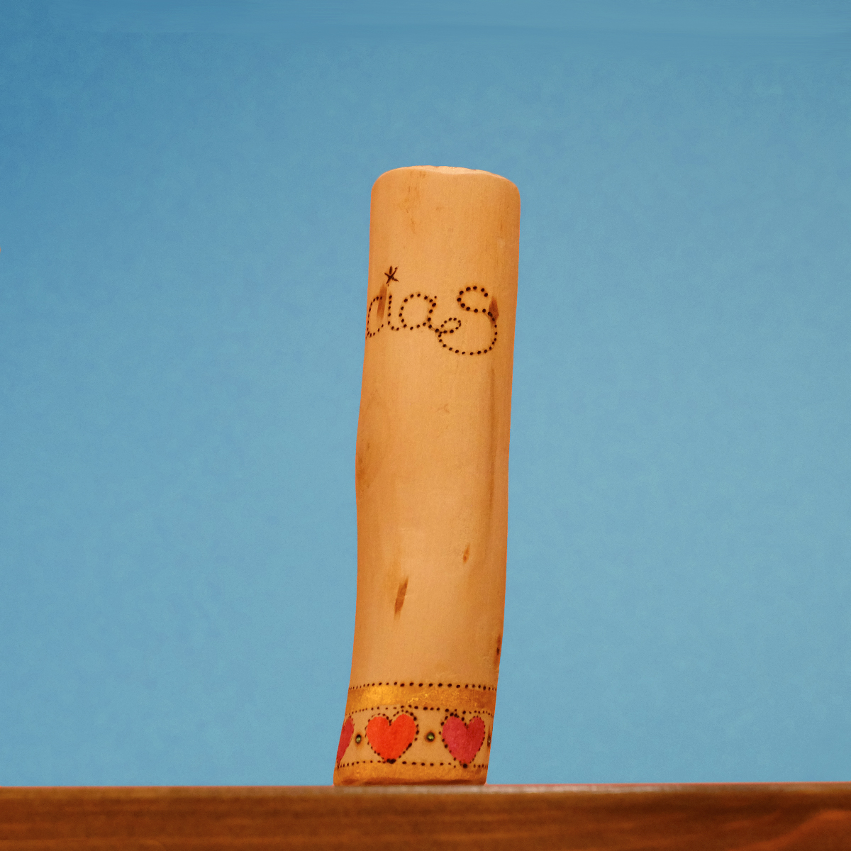 Si quieres expresarle tu gratitud y te gustaría hacerlo de forma especial, posiblemente te gustará este tótem único. Es una ramita de madera (de 12,5 cm de alto x 3 cm de diámetro) que hemos secado y lijado hasta dejar muy suave y luego, de forma sencilla y con la intención de expresar sensibilidad, hemos pirograbado la palabra «GRACIAS» y unos corazones, símbolo de agradecimiento. Y en el extremo visible de la maderita (cuando la dejamos de pie) hemos grabado un motivo radiante. Luego, con acuarelas iridiscentes de colores cálidos, hemos iluminado este mensaje. Un regalo para dar las gracias original, bonito y que permanece en el tiempo.