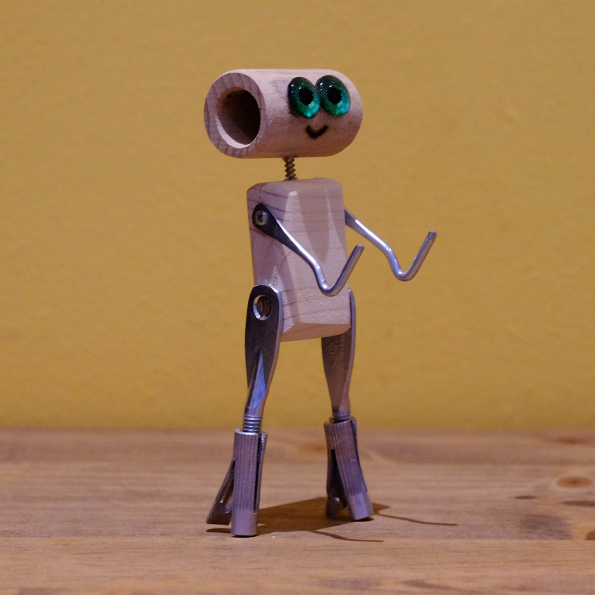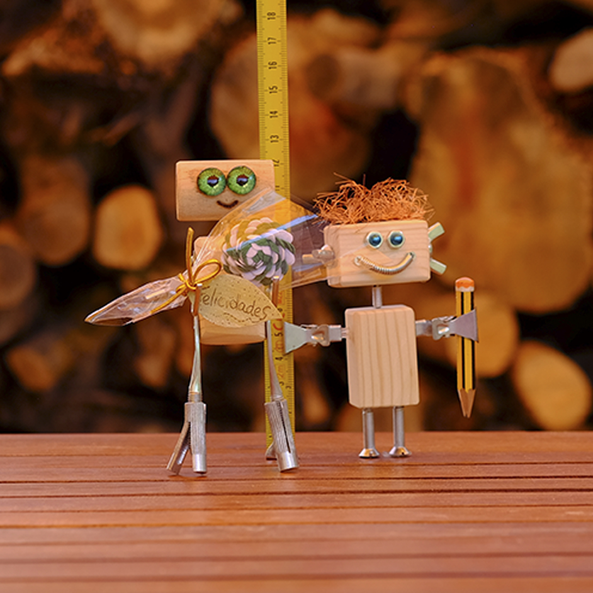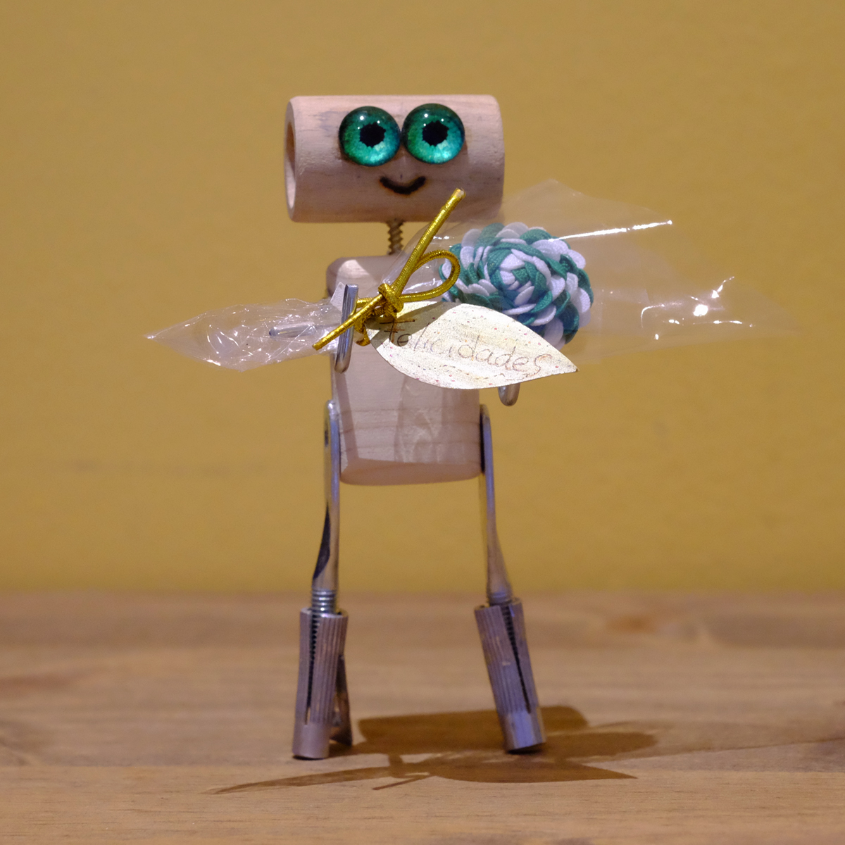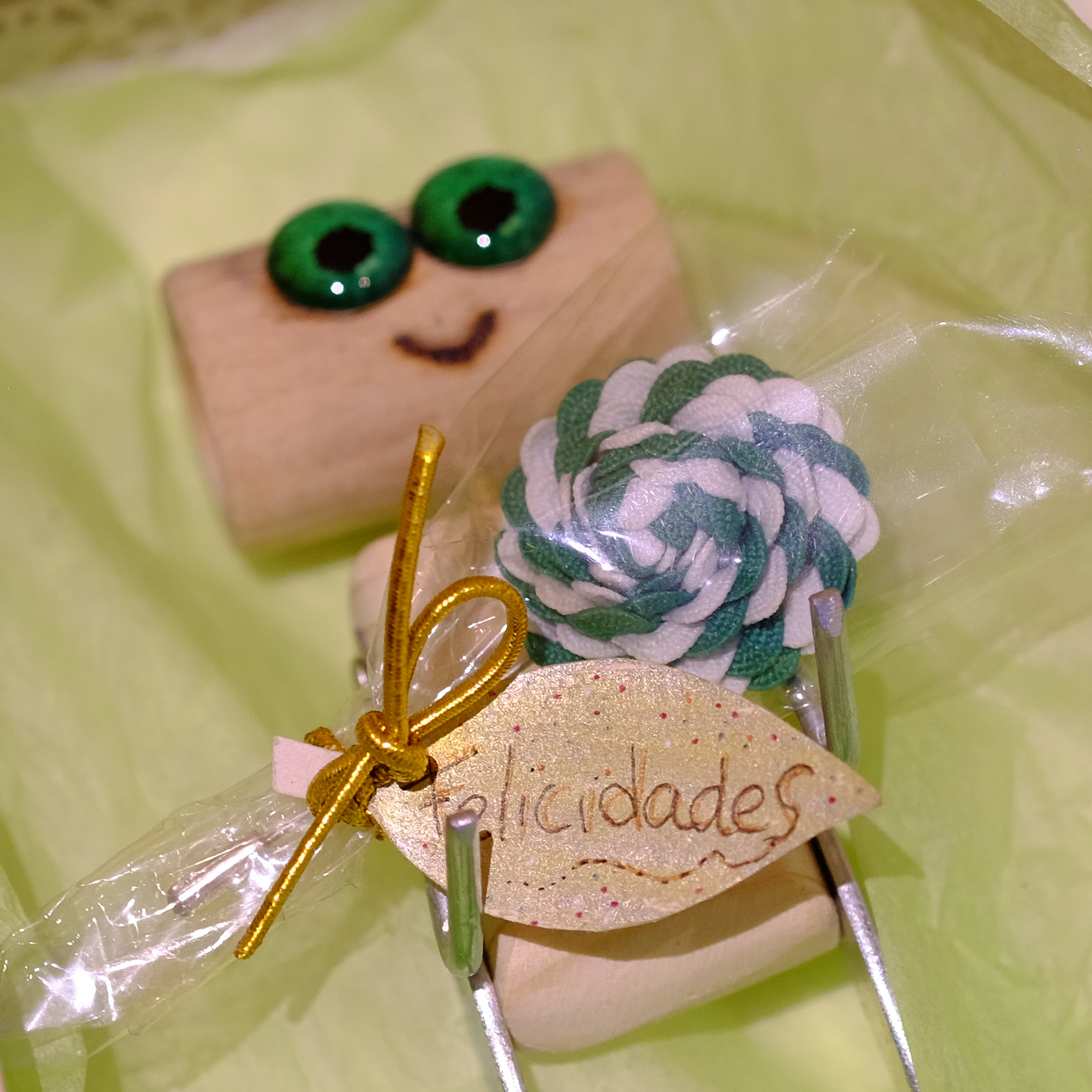 Paloverso es un original universo de madera, donde aparecen curiosos y simpáticos seres continuamente. Un día, de pronto, de un tubo hueco de madera, con unas aldabas y unos tornillos de presión se armó un gracioso individuo, al que en un principio llamamos «Por una oreja me entra y por otra me sale», dada su cualidad de cabeza hueca. Luego, esos hermosos y llamativos ojos verdes nos hicieron cambiarle el nombre. Y ahora, muy contento, se dispone a felicitar a quien tú quieras con su original ramo, que es un alfiler para la solapa, hecho a mano. Así que nuestro «Ojos verdes» es un regalo diferente y que sin duda, hará sonreír a quien lo reciba.