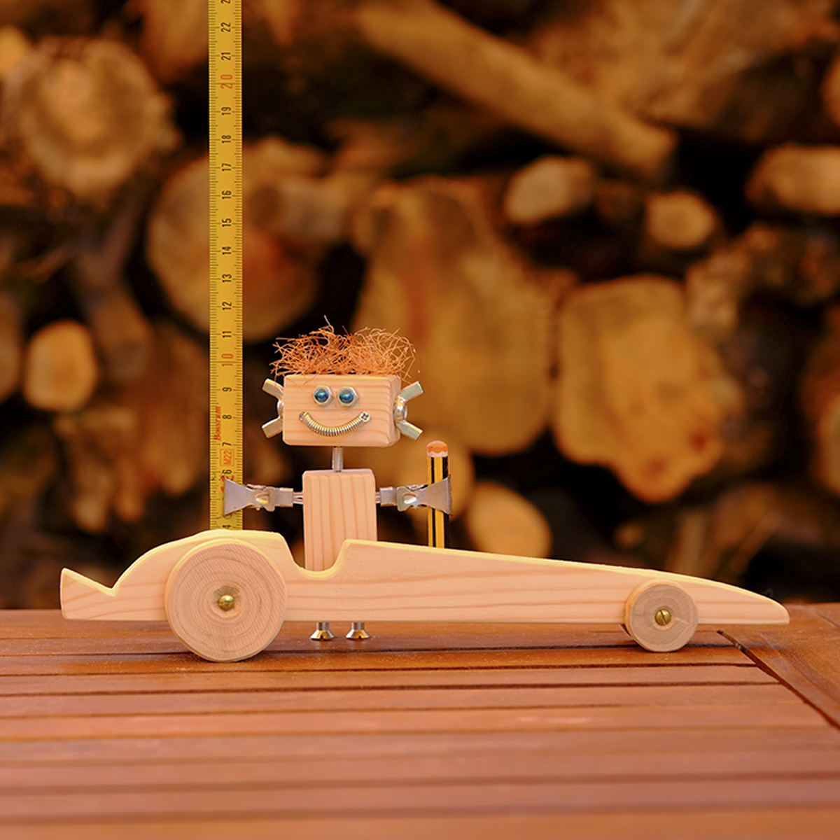 El superbólido es de madera maciza de pino, con ruedas de rodajas de ramas y su altura es de 4 cm, como se puede ver en la fotografía en la que nuestro ayudante sostiene el metro (el ayudante no está incluido con el coche). Y como todo en Paloverso, está hecha con nuestro particular método Slow Wood: a mano y con cariño.