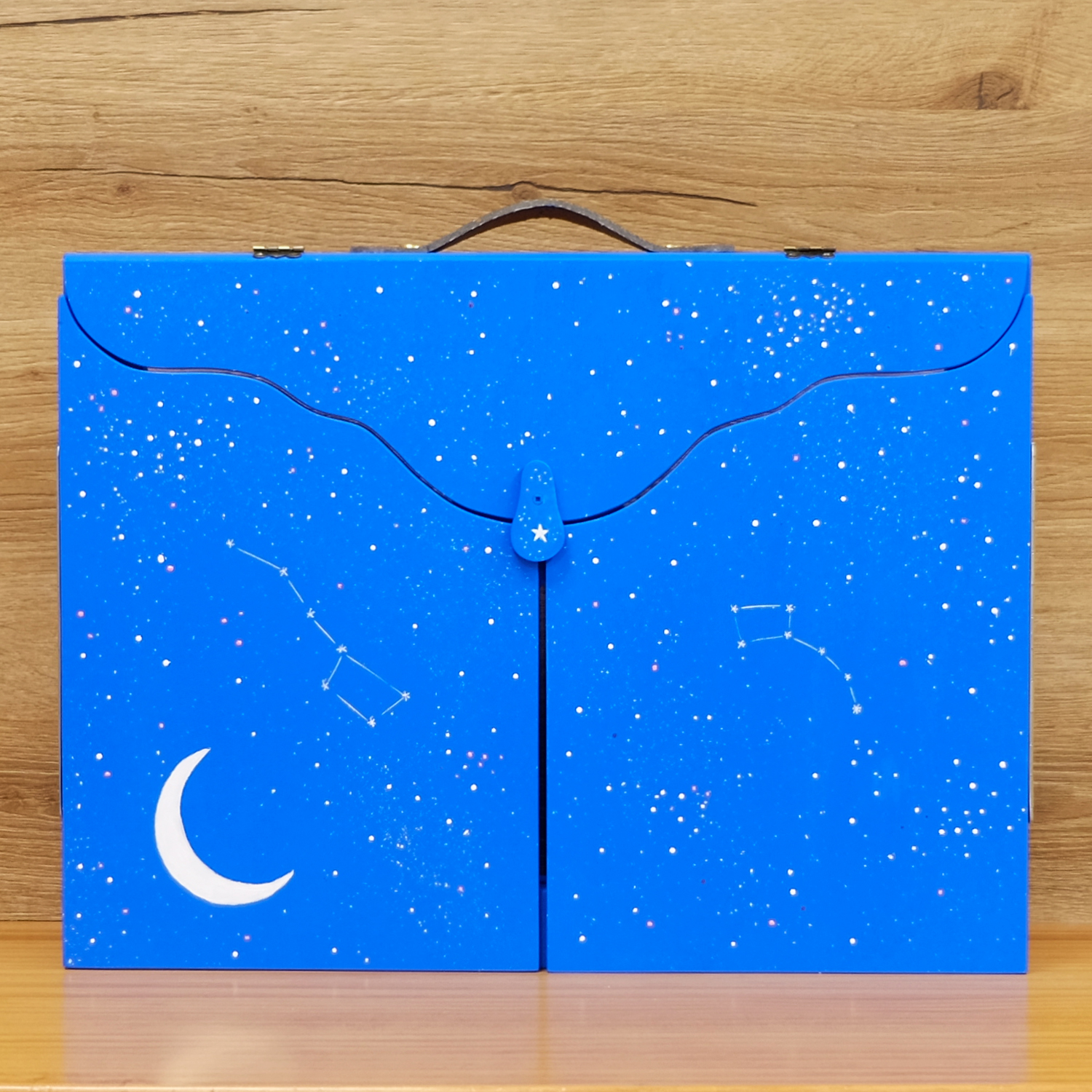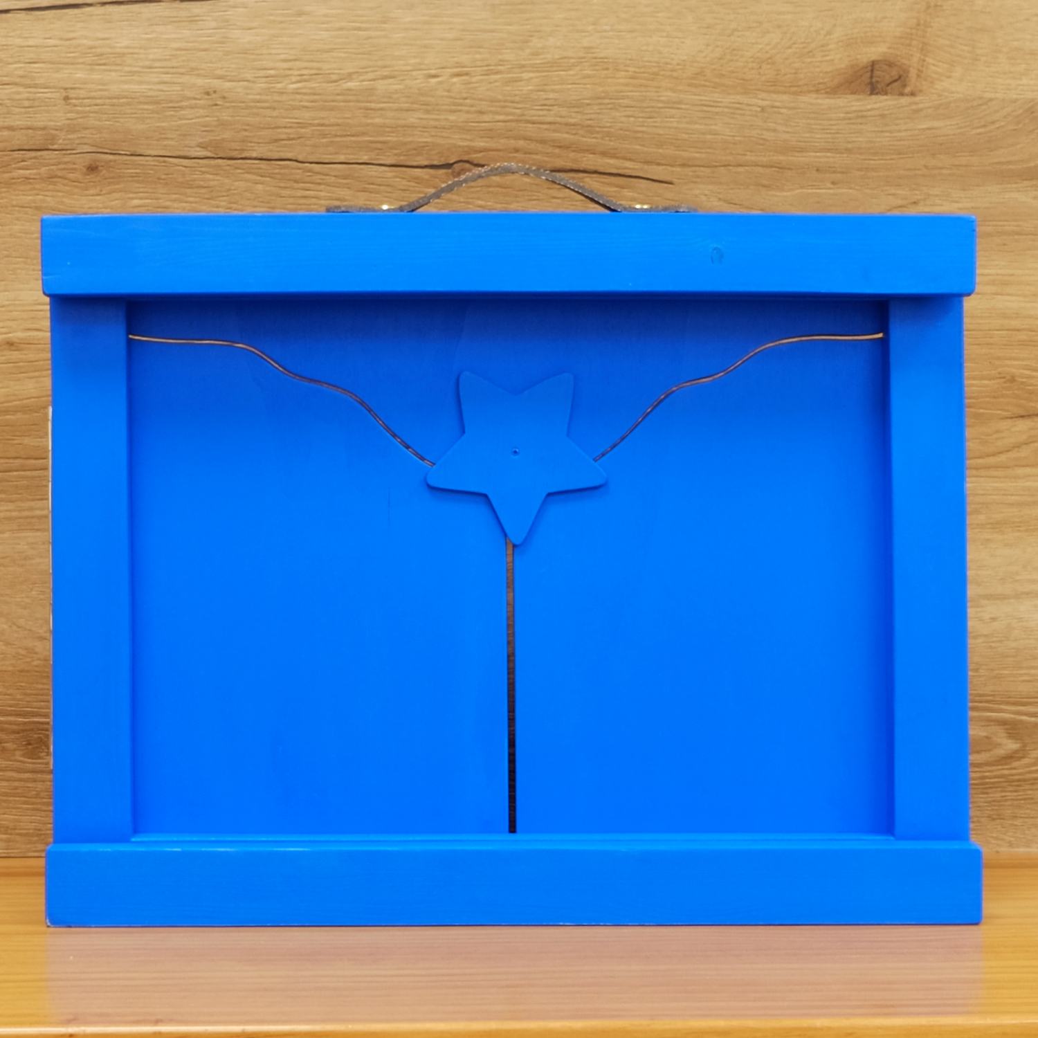 Este Kamishibai «Estrella Polar» es de tamaño grande ó A3. Mide 45,5 cm x 37 cm y tiene 5 cm de grosor. Los kamishibais A3 están diseñados para usar las láminas de formato A3, formato estandarizado de 42×30 cm (se corresponde al tamaño doble de un folio).