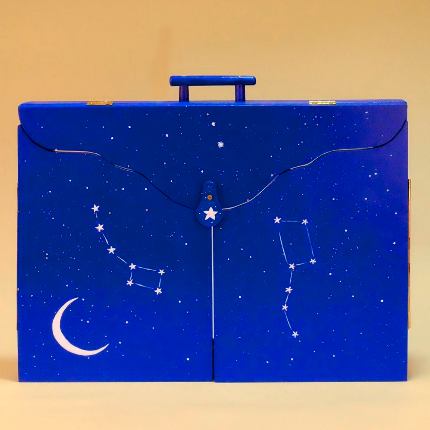 Este Kamishibai «Estrella Polar» tiene el cielo pintado en sus puertecillas, especialmente la Osa Mayor, la Osa Menor y dentro de ésta, la Estrella Polar. Hemos hecho este dibujo porque este teatrillo infantil es como una puerta que nos abre todas las posibilidades del universo, una puerta a la imaginación.