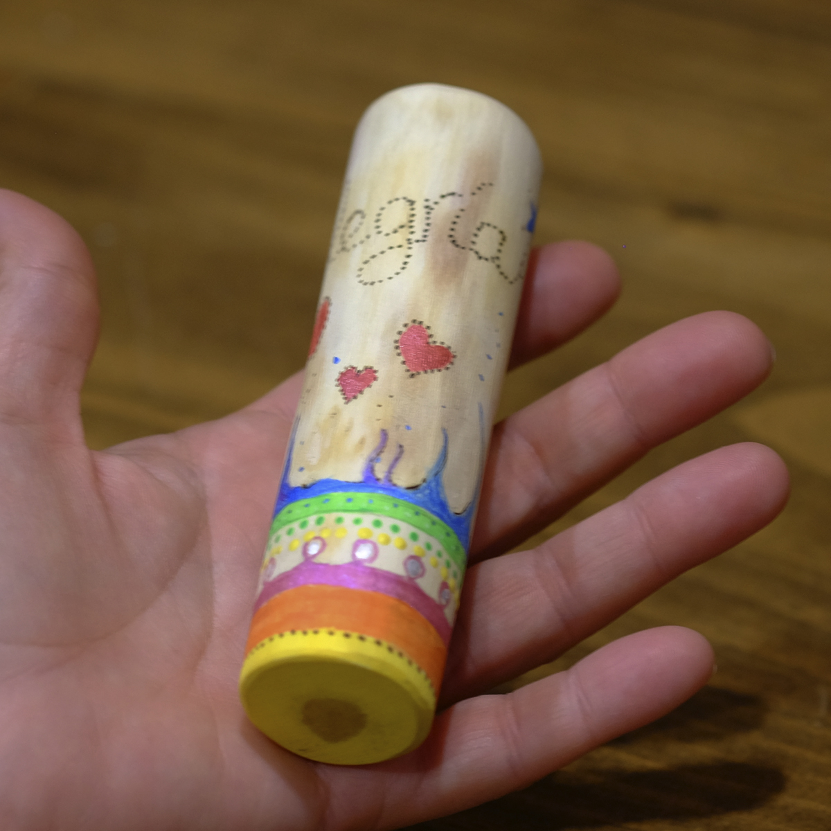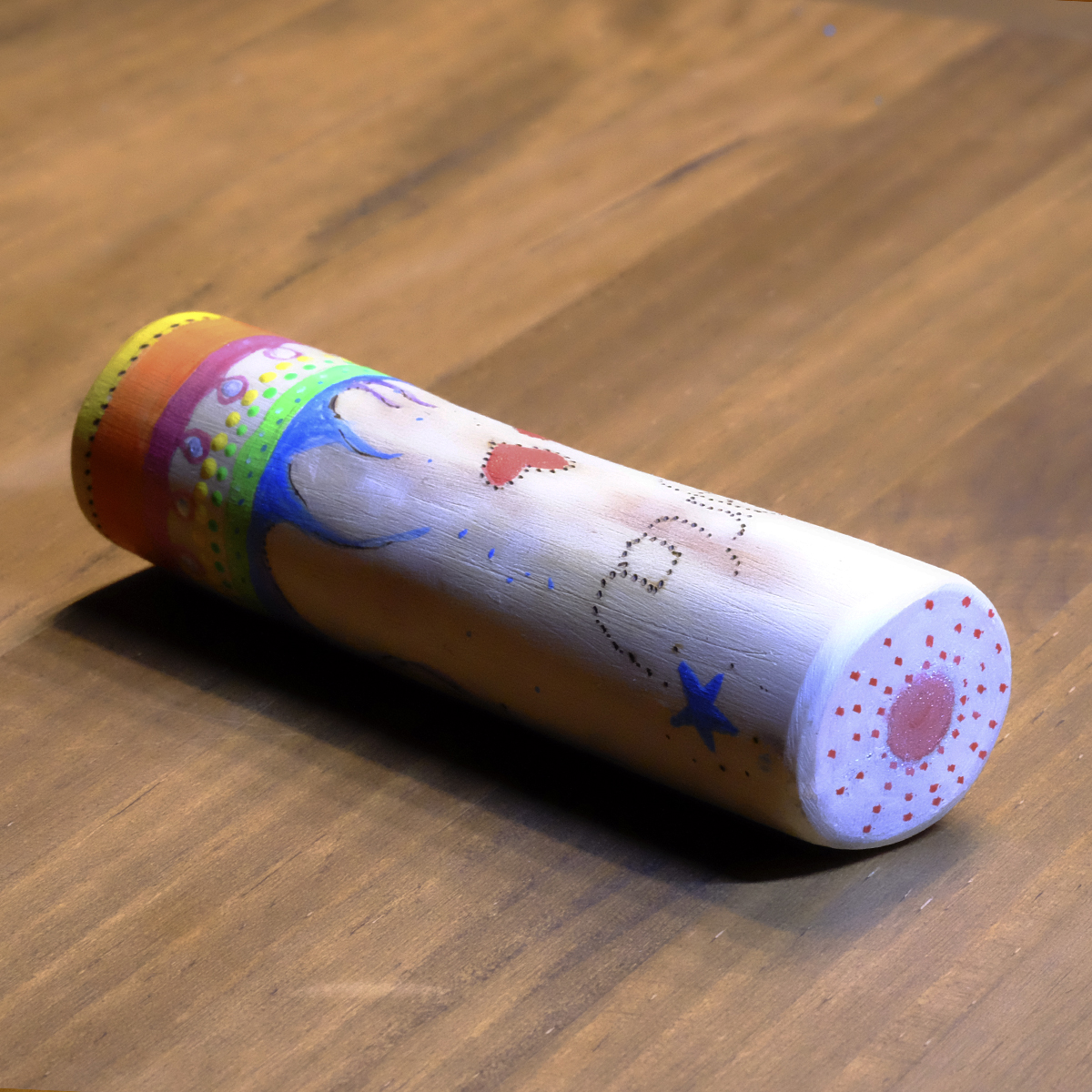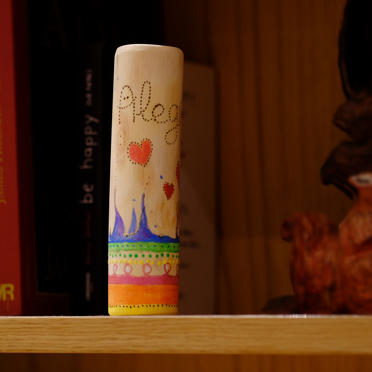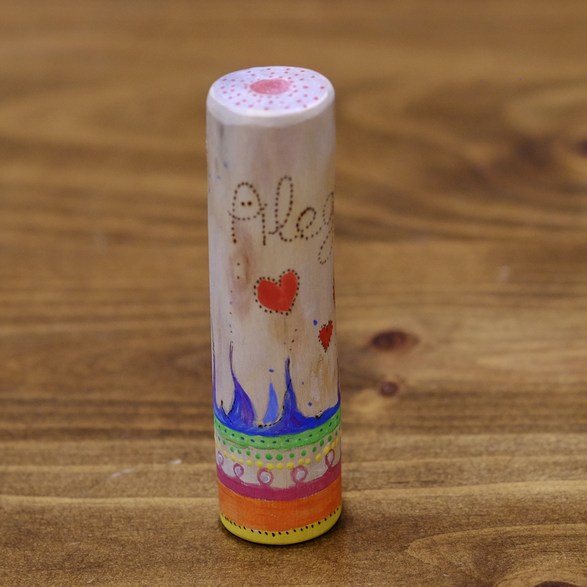 «Tótem Alegría», pequeño objeto de poder que nos recuerda mantenernos en una energía de alta vibración. No hay dos tótems iguales y este «tótem Alegría» es único: lo hemos pirografiado y pintado con colores luminosos y brillantes y formas en movimiento, para recordarnos alimentar la chispa de la alegría que nos hace resplandecer.