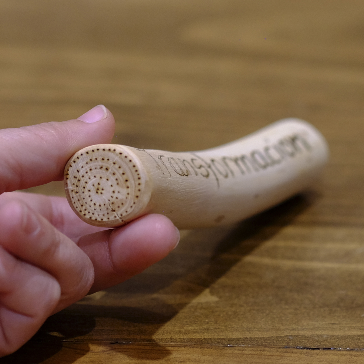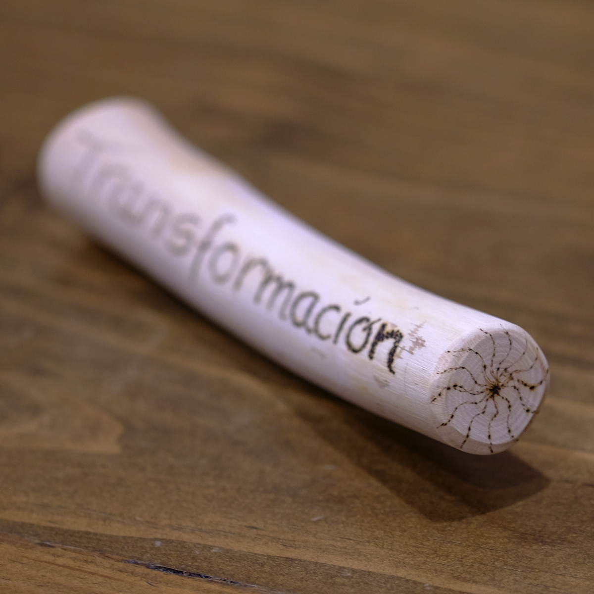 Éste es un tótem sobrio, sencillo y contundente. Tiene 15,5 cm de alto y 2,5 cm de diámetro, es una rama que hemos secado y preparado cuidadosamente, para dejar su madera muy suave y agradable al tacto. Después lo hemos pirografiado sólo con la palabra «TRANSFORMACIÓN» haciendo un efecto de cambio en su caligrafía, desde las letras iniciales de trazado tenue que se van engrosando hasta las letras finales, de trazo grueso y rotundo. ¡La misma palabra se está transformando! Y no hemos añadido más adornos ni colores, porque el proceso de transformación requiere centramiento, tener un objetivo concreto y sin distracciones.